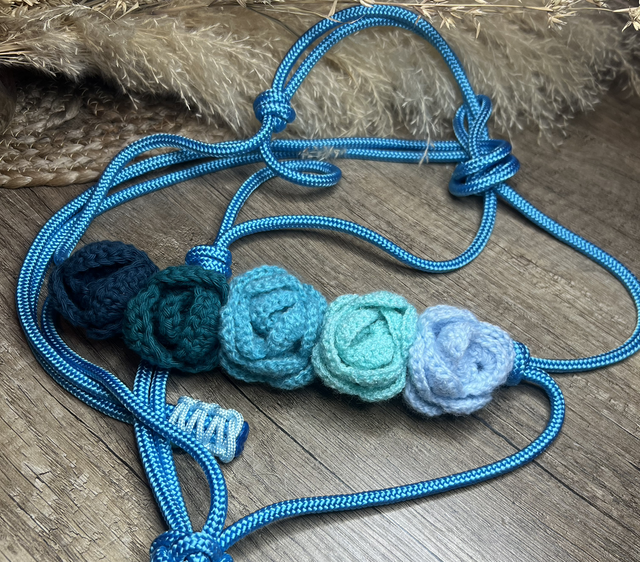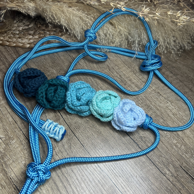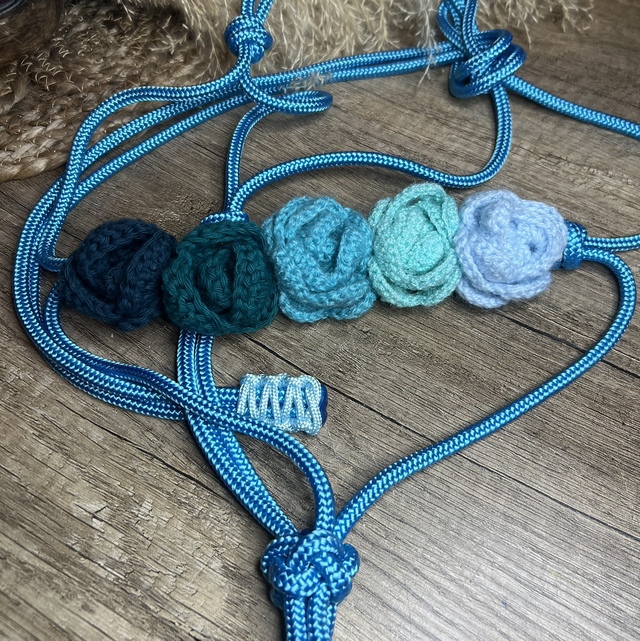 Les fleurs sont crochetées par Marie, puis cousues par Aurore sur les licols faits par elle-même.